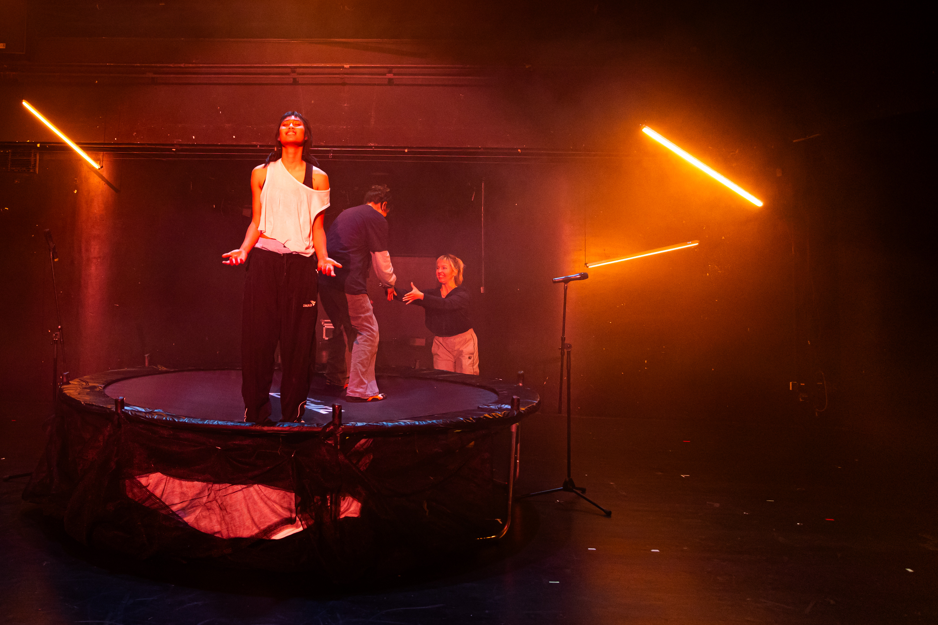 The performance is split into two parts. In the first half, the dramatic setting is a kind of abstract, dreamlike timelessness, in which we only distantly sense a hospital. The dramatic text primarily explores the feeling of anxiety, dealing with traumatic experiences, and their consequences. It presents a vision of life as an eternal fall into the unknown, at the end of which nothing matters but the landing. It would be simplistic to interpret this landing merely as death or human finiteness, but in the context of the performance, it is more about processing mental shocks and finding inner peace. Through two fantastical stories – one about a man who fell from a height and landed uninjured like a cat, and another about a lady who broke her leg but was actively cleaning her house two weeks later – the text touches upon, and critically reflects on, the societal expectation of an eternally positive approach to life, while aptly pointing out the distinction between mental and physical health.