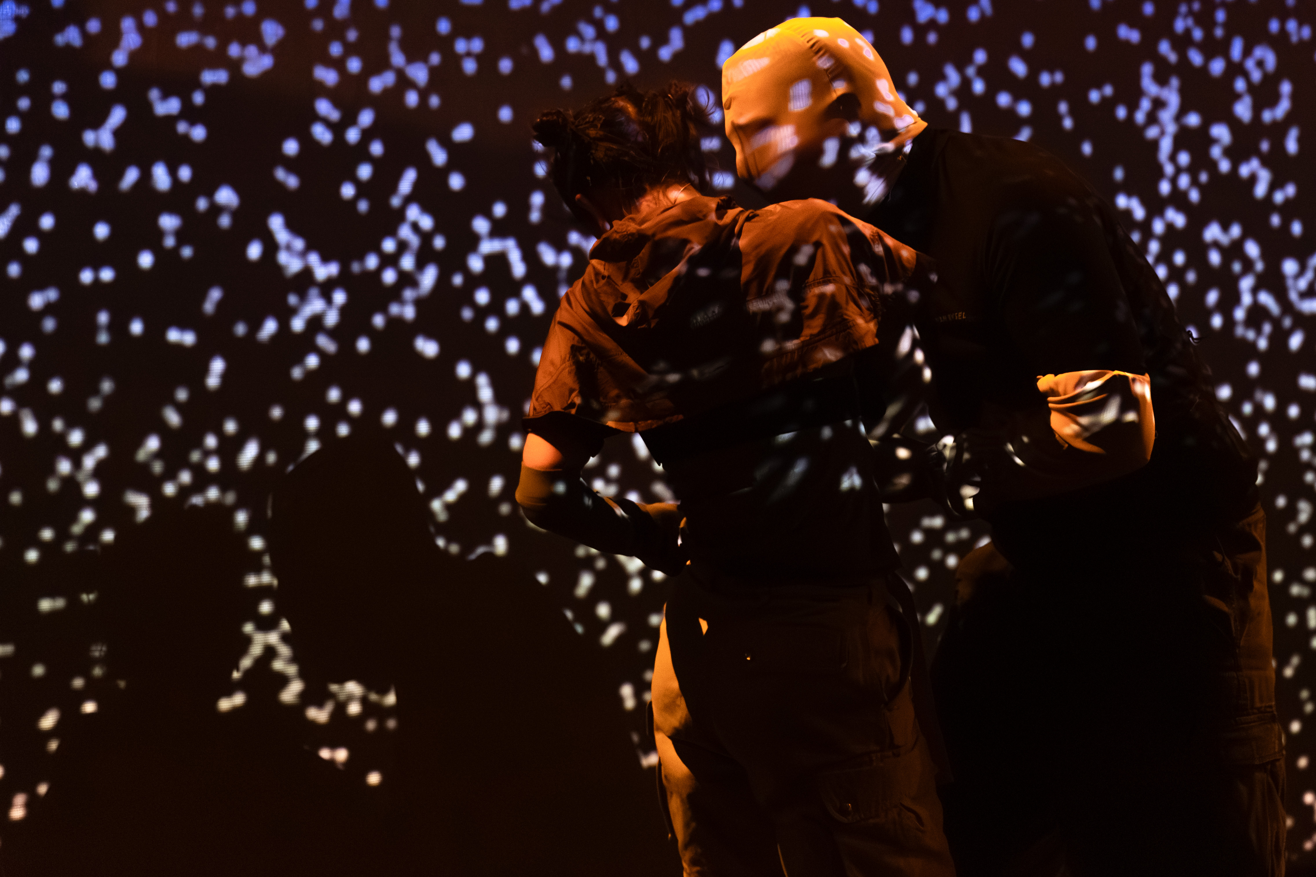 Už samotný imerzivní formát divadla, ve kterém se můžete pohybovat po celém sále i předsálí, vás nutí k neustálé ostražitosti. Divák neví, kam se koukat dřív. Kolem vás se míhají herci a z různých koutů se ozývají útržky dialogů. Tento vyvolaný rozklad diváckého zážitku zrcadlí roztříštěnost, ve které existujeme venku.