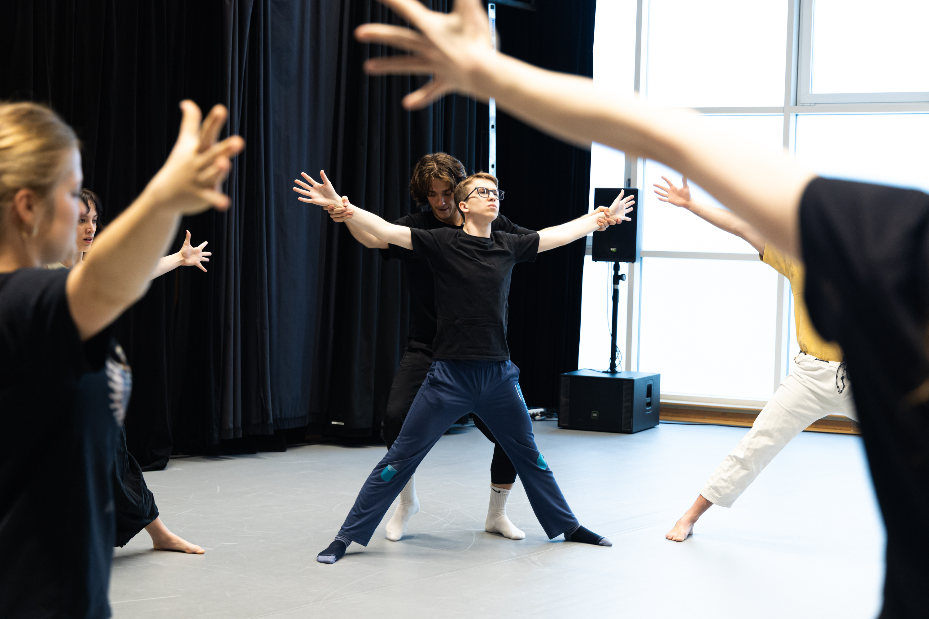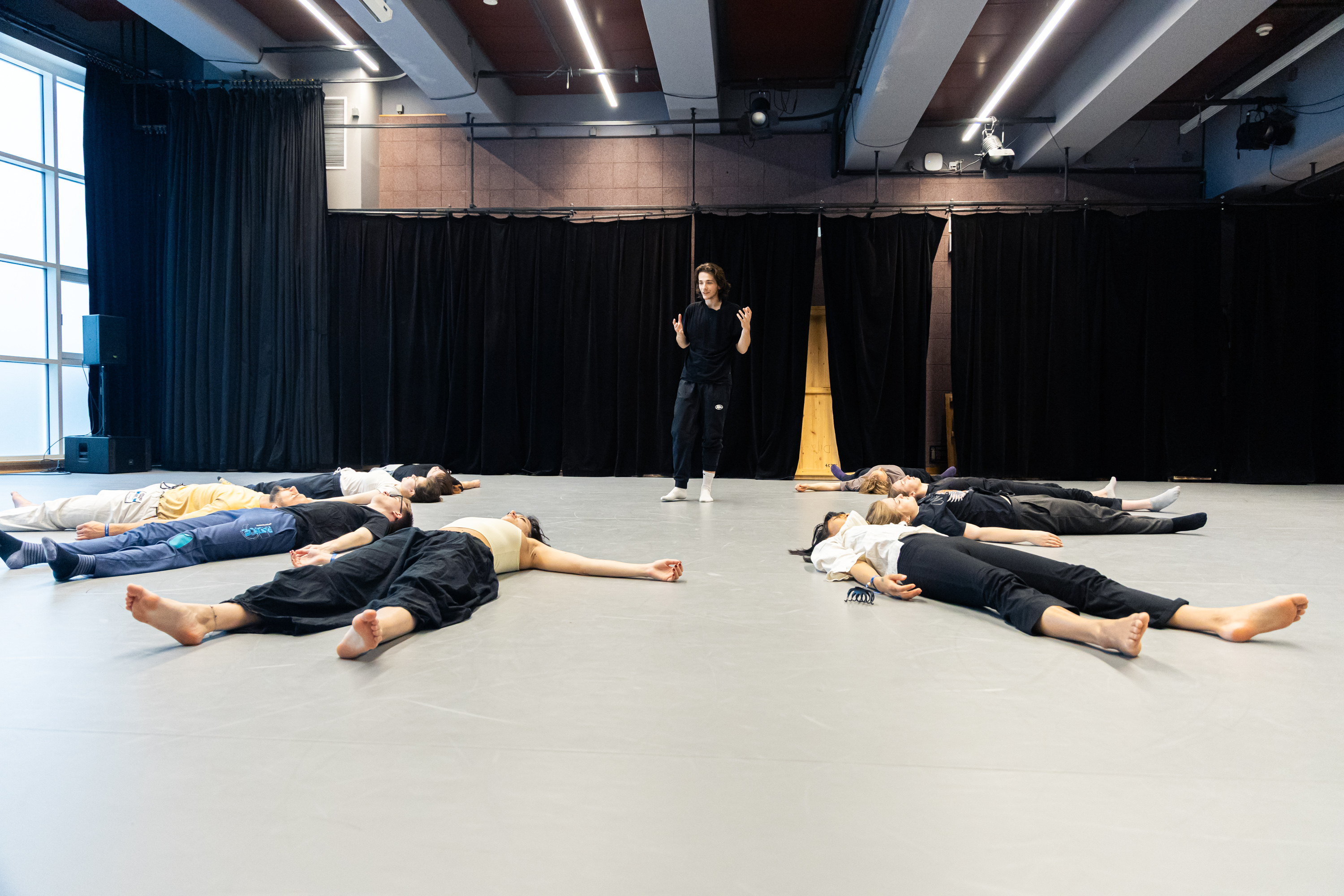 Zdánlivě jednoduchá rozcvička se promění v plnou aktivaci těla, která je zásadní zejména pro fyzické divadlo a pantomimu.