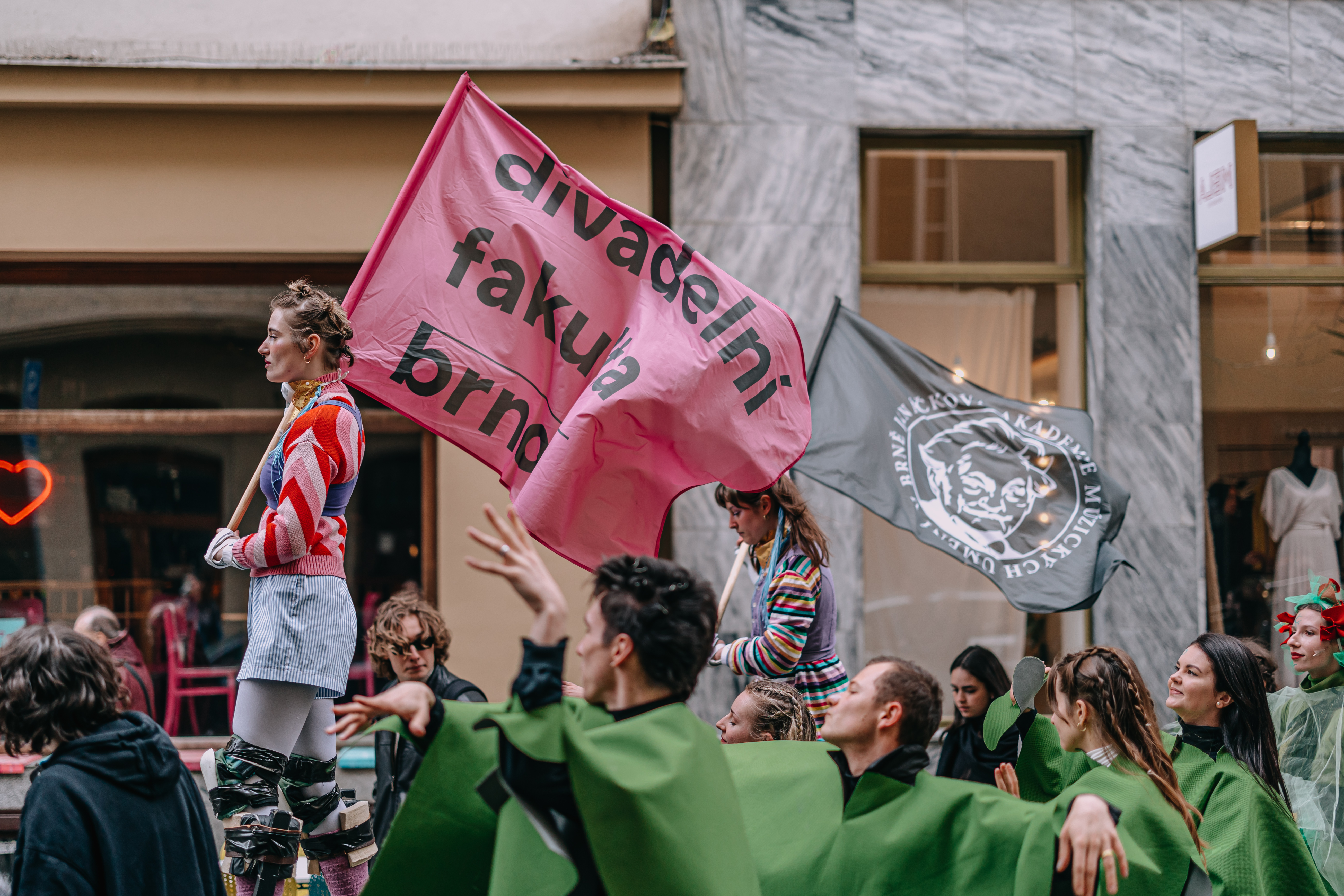In addition to the main program, attendees could take in the festival’s Off-program, which included an opening procession, concerts, parties, as well as welcoming and closing ceremonies. The Opening Parade started from the Theatre Faculty of JAMU, passed through Freedom Square, and led to the Courtyard of the Old Town Hall where the opening ceremony took place. Following that, four bands performed: Toad Planet, Ghost of You, Krajina Ró, and Mezi Patry Klid. Subsequent evenings featured parties at the venues Kavárna Trojka and ArtBar Druhý Pád, where visitors enjoyed music from bands like Midnight Swimmers, InFlus, Trible-J, NESSYE, Space Bandits, Beach Bum, the JAMU Jazz Band, and DJ Rubenze. The closing ceremony and subsequent party took place at the Theatre Husa na provázku, accompanied by the band Kolorez and DJ Sterk and DJ Palec.