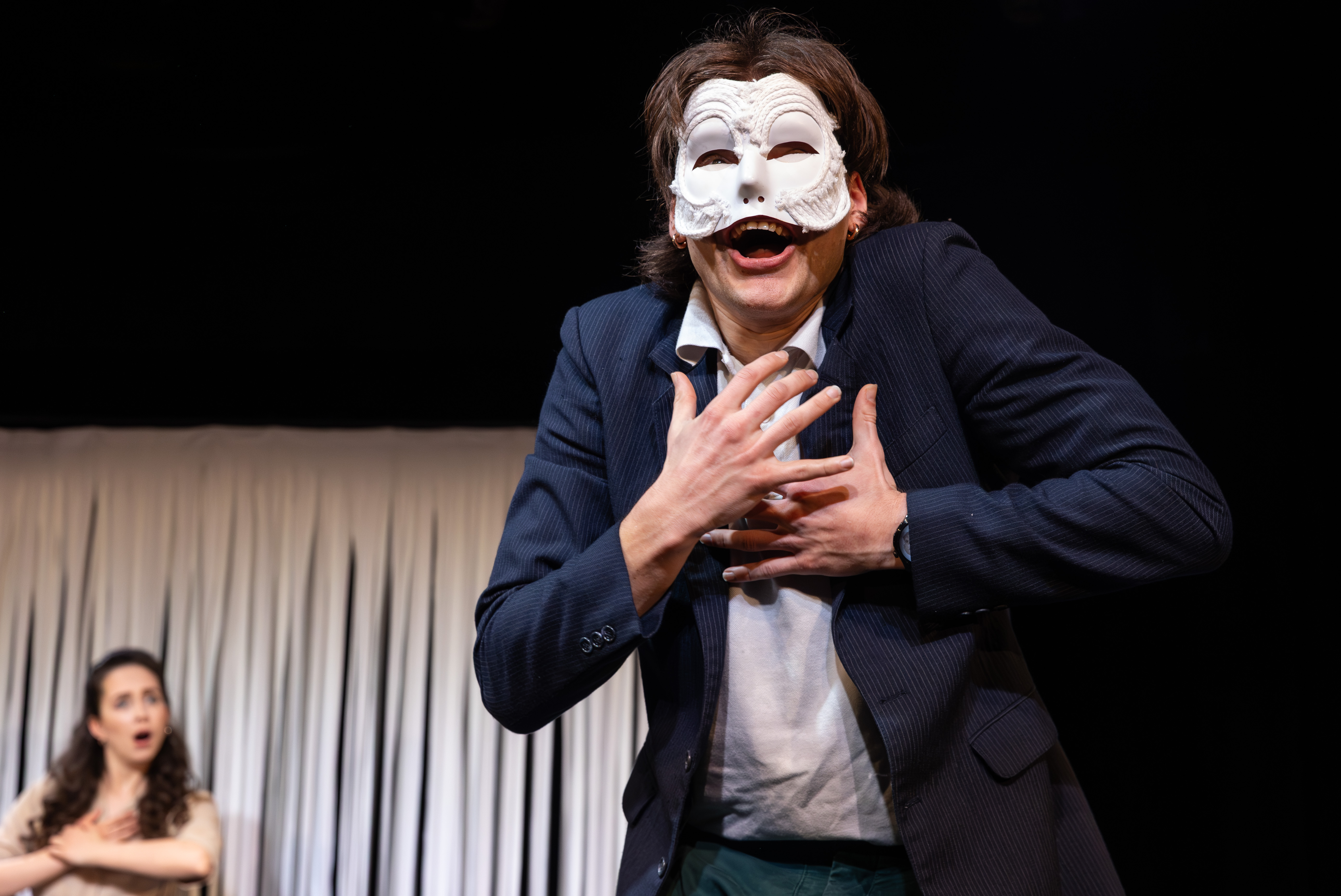 The masks used are entirely white, covering the upper part of the face, and their most striking feature is their texture. The material resembles rope, which shapes the facial features into deep wrinkles, furrowed brows, and pronounced reliefs recalling the expressive masks of traditional commedia dell’arte. Yet the masks are not strongly differentiated; placed side by side, it would be difficult to tell which belongs to which character. Attached with elastic, they cover only the front of the face, so when an actor turns sideways, a sharp, almost jarring transition appears between the mask and the bare face. As a result, the masks function primarily from a frontal perspective, emphasizing both their stylization and a certain “imperfection” as a theatrical sign.